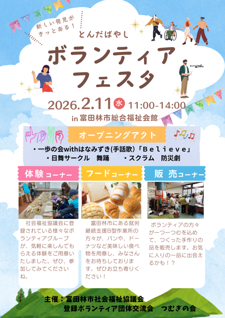 総合福祉会館にて、ボランティア活動の素晴らしさを伝えたり、地域で活躍するボランティア団体を知ってもらったりすることを目的に、「とんだばやしボランティアフェスタ」を開催します。